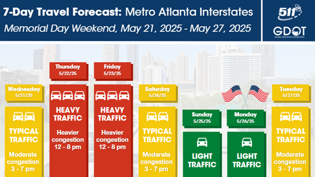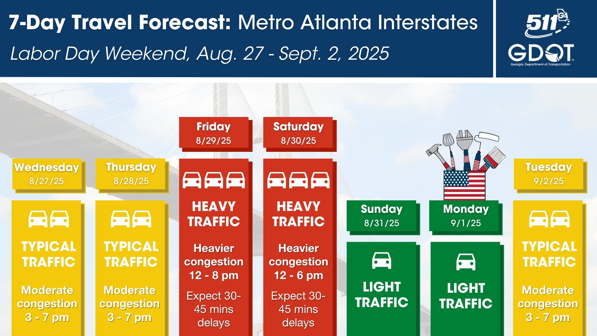 For real-time traffic updates, visit 511ga.org, download the 511 Georgia mobile app, or follow 511 Georgia on Facebook and X. Travel smart, stay safe, and make the most of your Labor Day weekend!